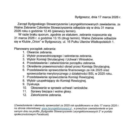 Zarząd Bydgoskiego Stowarzyszenia Laryngektomowanych zawiadamia, że Walne Zebranie Członków Stowarzyszenia odbędzie się w dniu 24 marca 2020 roku o godzinie 12.30 (pierwszy termin; drugi termin – godzina 13.00) w Klubie „ORION” w Bydgoszczy, ul. 16 Pułku Ułanów Wlkp. 1.